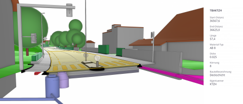 Bruchkanten und Strassenabschlüsse wurden für die detaillierte Modellierung des Strassenkörpers mittels Punktwolke und infra3D Strassenbildern digitalisiert. Die Möglichkeit, dabei einzelne Digitalisierungen direkt in infra3D vorzunehmen, bietet maximale Flexibilität im Arbeitsablauf. Der kontinuierliche Abgleich mit der digitalen Strasse ermöglicht es, alle Details der Bauteile wie Position, Form oder Oberflächenbeschaffenheit exakt zu ermitteln und im Modell wahrheitsgetreu umzusetzen. Der Abgleich zwischen Modellierung und Punktwolke gewährleistet eine optimale Qualitätssicherung des gesamten Modells. Zudem zeigt infra3D die genaue Lage und Höhe der Schachtdeckel verschiedener Gewerke, sodass deren Position einfach überprüft werden kann. Die Mehrheit der Daten für die Werkleitungsmodellierung wurden aus den vorhandenen Werkleitungskatastern bezogen. Mit der Integration der 3D-Gebäude von SwissBuildings3D wurde das Modell zusätzlich angereichert. Der Informationsgehalt der Bauteile wurde auf die Anforderungen des Auftraggebers ausgerichtet, sodass das Modell eine verlässliche Grundlage für eine effiziente und optimale Planung, Projektierung und Ausführung bietet. Zusätzlich liefert das digitale Bestandsmodell wertvolle Informationen für die zukünftige Bewirtschaftung und den Unterhalt der Strasseninfrastruktur.