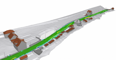 Als Basis für die Modellierung diente die Befahrung und Digitalisierung des Strassenraums durch die iNovitas AG. Die benötigten Punktwolken konnten so direkt aus infra3D bezogen werden. Dank der verbesserten Georeferenzierung erfolgte eine genaue Positionierung der Punktwolke, welche die Grundlage für das Bestandsmodell bildet. Durch die Kombination der Bodenaufnahmen mit ergänzenden Drohnenbildern entstand anschliessend ein flächendeckendes digitales Geländemodell (DGM).